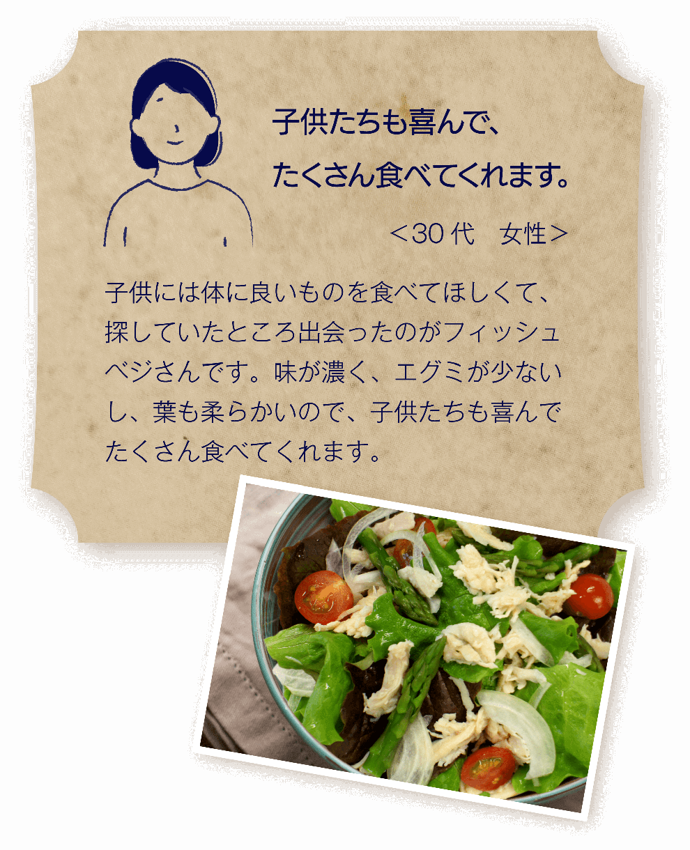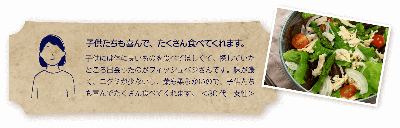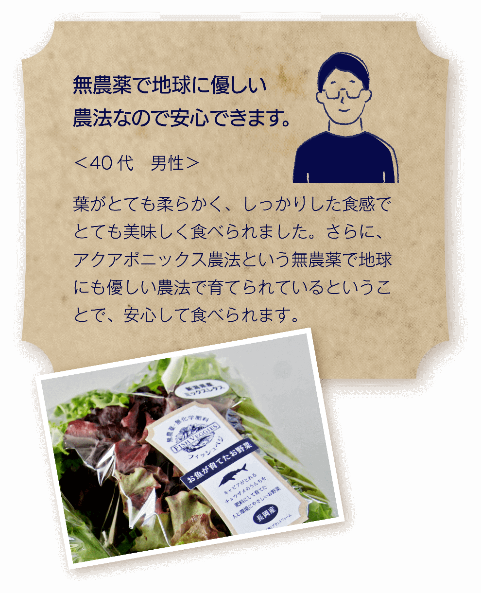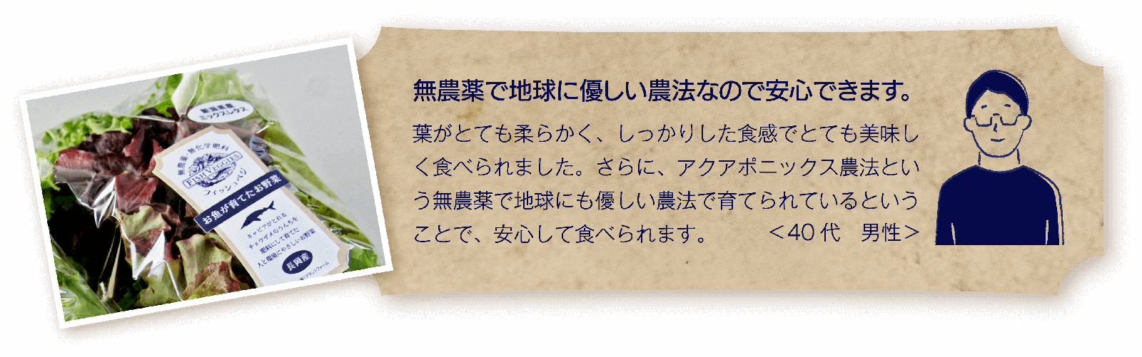 またお魚にとっても、植物が栄養を吸うことで水が浄化されるため、魚と野菜で共存共栄の関係が築かれています。人にやさしいだけでなく、地球にもやさしい。フィッシュベジは安心安全を実現し、未来の子供たちに持続可能な農業としてつないでいきます。
